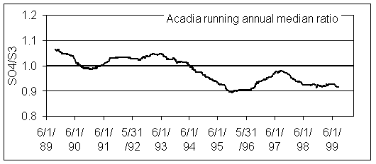 Figure 2. Running annual median ratio of SO4/S3 at Acadia National Park. Data collected before 3/18/89 are excluded.