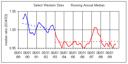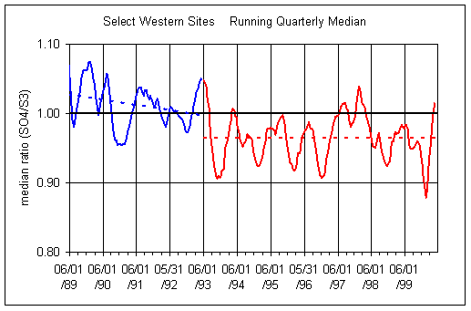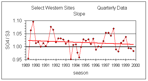 Figure 4 shows the slope of SO4 vs S3 for the Select Western sites for each quarter since summer 1989. Overall, the slopes are slightly greater than unity (1.02 ±0.03), indicating the calibration for sulfate gives a slightly higher value than that for sulfur. The important feature is the trend: there has been no significant trend in the slope between 1989 and 1999.