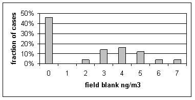 Sulfur on Teflon. In the CNL system, a clean Teflon filter is used to generate the x-ray background that is removed from the x-ray spectrum. Thus any sulfur in the filter media will be removed. The excess sulfur in field blanks is due to any contamination in handling. Figure 6 shows the distribution of sulfur concentrations on Teflon field blanks. A zero concentrations means that sulfur was not detected. None of the measurements were significantly about the minimum detectable limit. Because the sulfur in field blanks is so near the minimum detectable limit, we have chosen not to subtract any artifact from sulfur. If one were to subtract an artifact, the best choice would be the median value of 2 ng/m3.