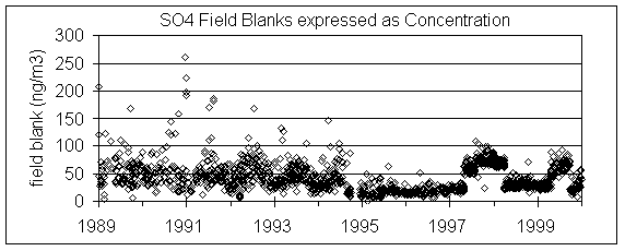 Figure 7 shows the sulfate concentrations of all nylon field blanks since 1989. The reported masses were divided by the standard volume to give equivalent ng/m3. Note that about 9/94, scatter of concentrations significantly decreased. However, even after that point there were two periods of elevated concentrations. During the 1997 period of elevated field blank, there was a significant change in the relationship with S3. If fact, after subtracting this large artifact, the agreement with S3 was better than during the periods with lower field blanks. As will be discussed, to get the best agreement we would have to assume that the true sulfate artifact was zero during the period with small field blank sulfate but equal to the median field blank during the high period.