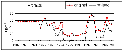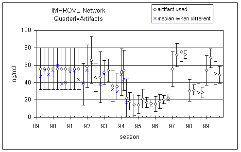 Figure 8 shows the artifacts for sulfate on nylon used in the data base. Before 9/94 they were calculated from the mean field blank, with outliers removed. After this date, they were calculated from the median field blank with no samples removed. The error bars are the standard deviations of the field blanks. If medians had been used during the early period, the artifacts would have been reduced by about 10 ng/m3. Considering the uncertainties during this period, we chose not to recalculate the concentrations using the median as the artifact.