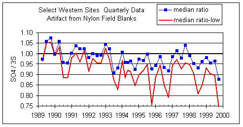 Figure 9 uses the artifact that was calculated from the field blanks. The ratios for the lower quartile are consistently lower than those for all samples, especially after summer 1993. As with the intercept analysis, this suggests that at low concentrations sulfate on nylon is significantly lower than sulfate on Teflon. That is, if the artifact of sulfate on nylon were to be decreased, or the artifact of sulfur on Teflon were to be increased, the ratios would be closer to unity and the discrepancy between all samples and the lower quartile would be reduced.