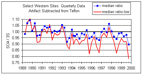 Figure 9. Quarterly ratio of SO4/S3 using the SO4 artifact as calculated from nylon field blanks and zero artifact for S on Teflon. The upper line is the median ratio for all samples. The “median ratio-low” line is the median ratio only for those samples that are in the lower quartile of SO4 concentrations. The lower quartile samples will be much more affected by artifact subtraction for both sulfate and sulfur.