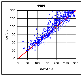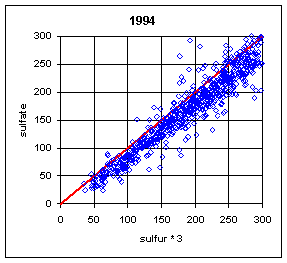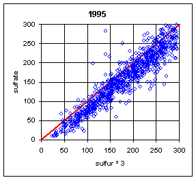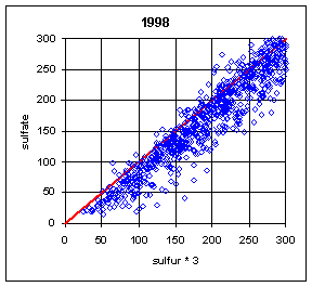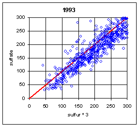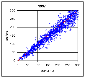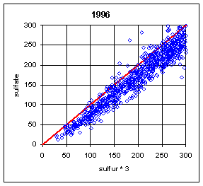 The ratio of sulfate/sulfur will depend on both the relative calibration of the two analytical systems (PIXE for Teflon filters and IC for nylon filters) and the artifact subtraction for the two variables. In order to isolate these two factors, it is better to examine the slope and intercept of the regression between the two variables. The slope is a measure of the relative bias in the calibration of the two analytical systems. For a single site, this slope will also include any bias in the flow rate calibration between the A and B modules. For multiple sites, the flow rate biases will presumably cancel, leaving the relative bias of the two analytical systems. The intercept primarily reflects the bias in the artifact subtraction. Thus a trend in artifact subtraction would result in a trend in the intercept but not in the slope. This argument assumes that the relationship is linear. The typical r2 of 0.98 indicates that there is a linear relationship.