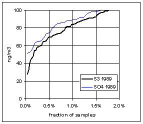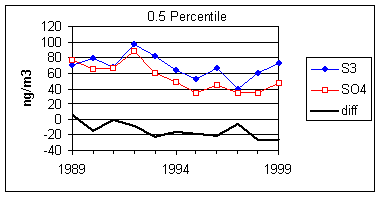 Figure 15 and Figure 16 show the distribution of S3 and SO4 by year for the lowest 2% of samples. The trends in minimum for the year and for three percentile concentrations are shown in Figure 17. In all cases, the difference changes by about 30 ng/m3 between 1989 and 1999. The biggest difference is in the minimum concentration for the year. For S3, there is no trend, with minimum concentrations averaging 30 ng/m3. For SO4, the average minimum is also around 30 ng/m3, but there is a significant trend going from 50 ng/m3 in 1989 to 10 ng/m3 in 1997, and rising slightly in the past two years. For the various percentiles, both variables show decreasing trends, but the decrease for SO4 is always larger than for S3.