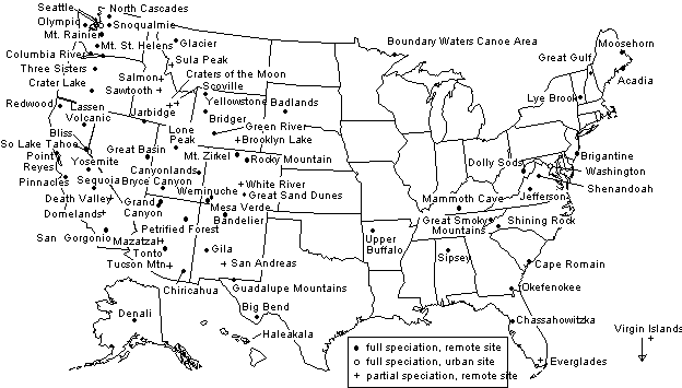 The current sampling sites in the IMPROVE network are indicated in Figure 1. The sites are separated into three groups: remote sites with full speciation, urban sites with full speciation, and remote sites with partial speciation. The full speciation sites sample PM2.5 particles on Teflon, nylon, and quartz filters. The measured variables for the three filter are shown in Table 1. PM10 samples are included at most of these sites to monitor the contribution of coarse particles to extinction. The partial speciation sites have only a Teflon filter or Teflon plus nylon filters. Flow audits are performed quarterly by the site operators or during the annual maintenance.