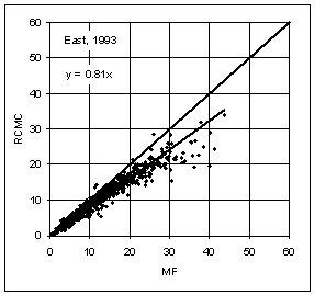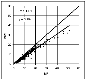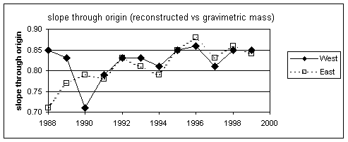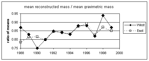 of reconstructed and gravimetric mass for Eastern sites for 1988-93.