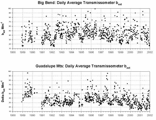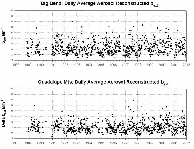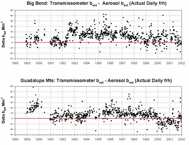 Figure 3 plots the difference between concurrent daily average transmissometer bext and daily reconstructed bext from speciated aerosol data at Big Bend and Guadalupe Mts. National Parks for the period 1989 – 2001. Examination of the plots shows: