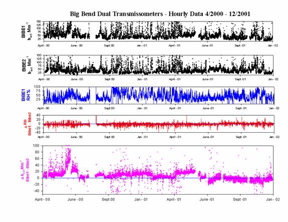 To investigate this issue a second transmissometer was installed at Big Bend in 2000 operating along the same path as the existing system, but about 30 m higher above the surface. Figure 4 plots various analyses of the dual Big Bend transmissometers. The same rapid, varying in intensity offsets are seen in the delta bext between the two transmissometers as seen in the transmissometer-aerosol delta bext in Figure 3.